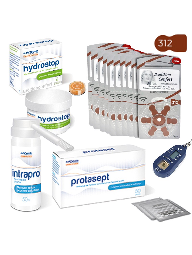Complete pack including 13 Rayovac 312 battery packs and all cleaning products necessary for the proper functioning of your hearing aids.