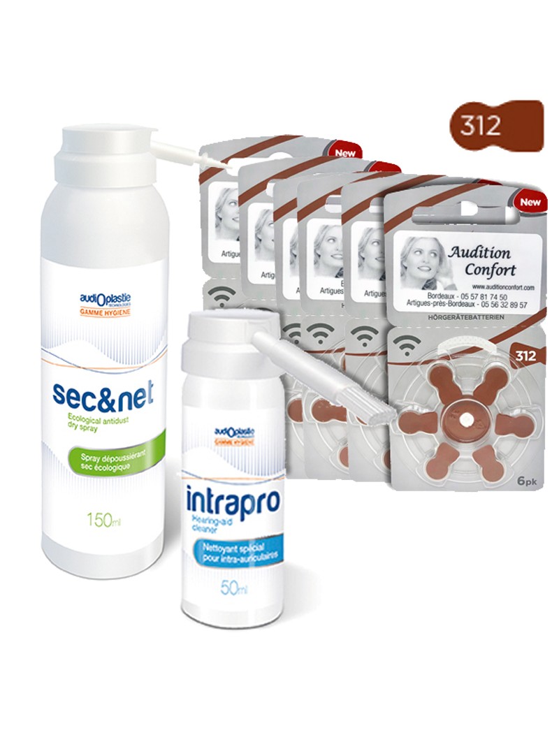 Complete pack of 6 Rayovac 312 battery packs and all the cleaning products you need for your hearing aids behind the Ear (BTE).