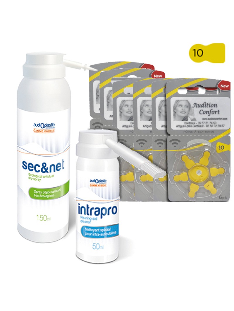 Complete pack of 10 Rayovac 10 battery packs and all the cleaning products you need for your hearing aids behind the Ear (BTE).